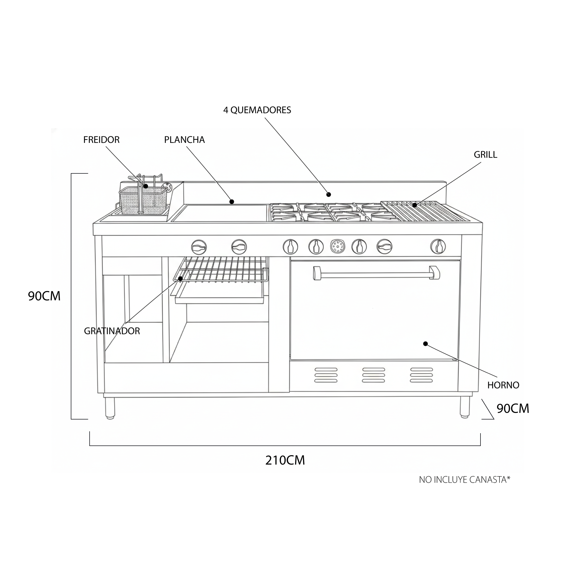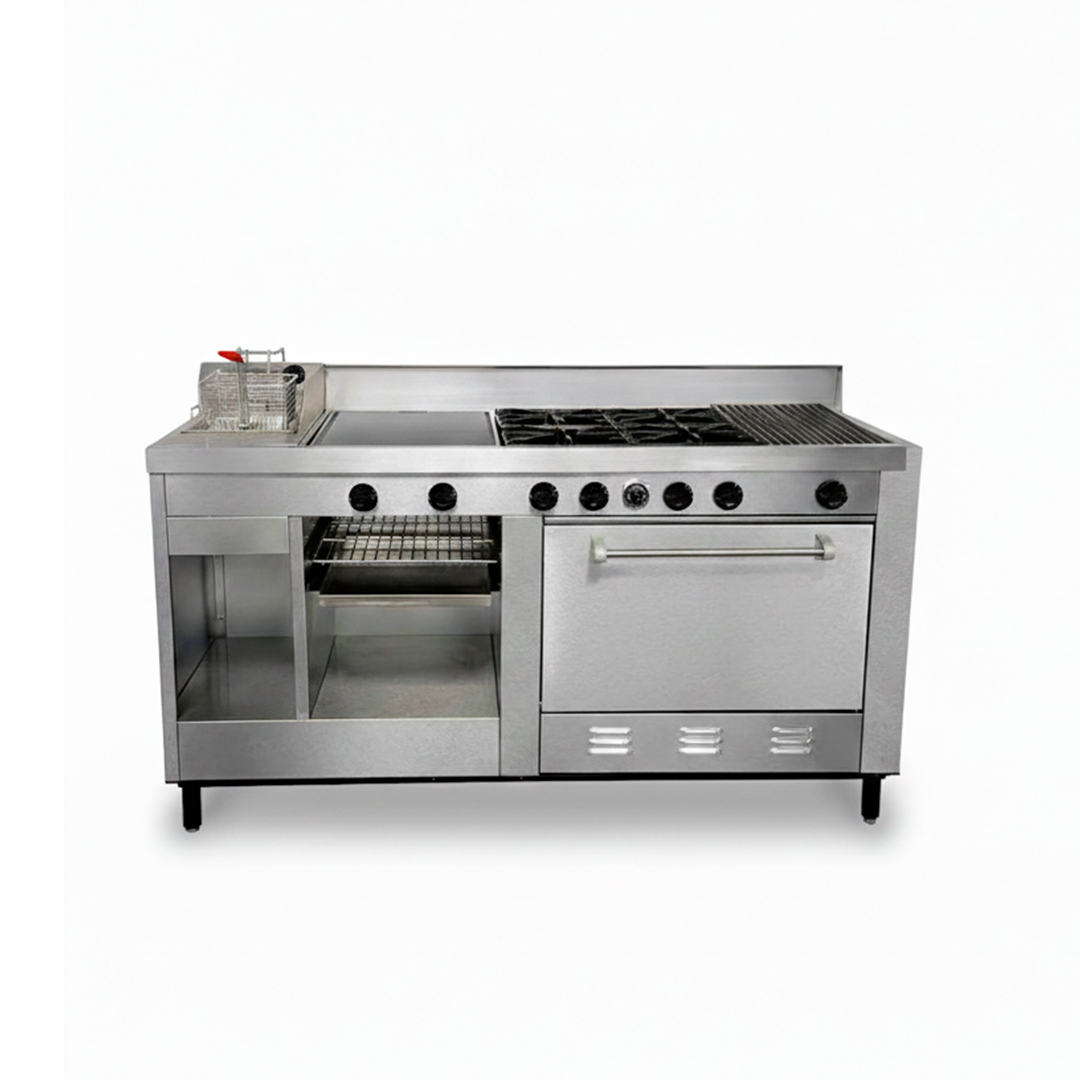 Equipo hotelero de alto rendimiento fabricado en acero inoxidable, diseñado para cocinas de máxima exigencia. Integra cuatro quemadores eficientes, plancha, parrilla, freidor, horno amplio y gratinador, ofreciendo versatilidad total en un solo módulo. Ideal para hoteles, restaurantes y comedores institucionales que necesitan productividad, resistencia y eficiencia en cada servicio.