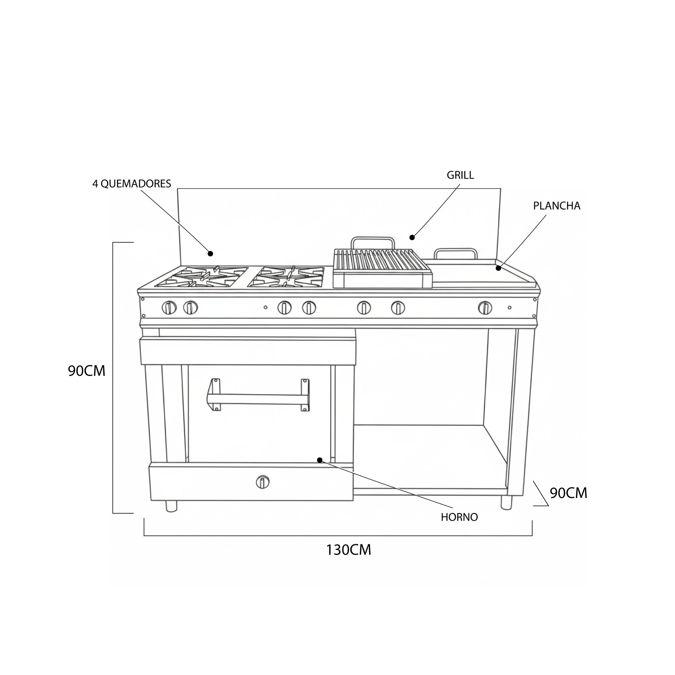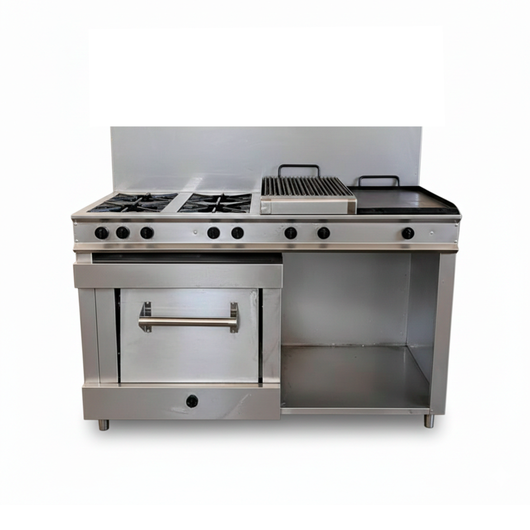 Equipo económico de alto rendimiento, ideal para cocinas comerciales que buscan versatilidad sin elevar el presupuesto. Integra cuatro quemadores eficientes, plancha amplia, grill para asados perfectos y horno integrado, permitiendo múltiples preparaciones en un solo módulo. Fabricada en acero inoxidable, resistente, fácil de limpiar y diseñada para trabajo continuo.