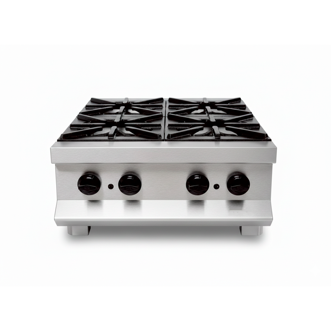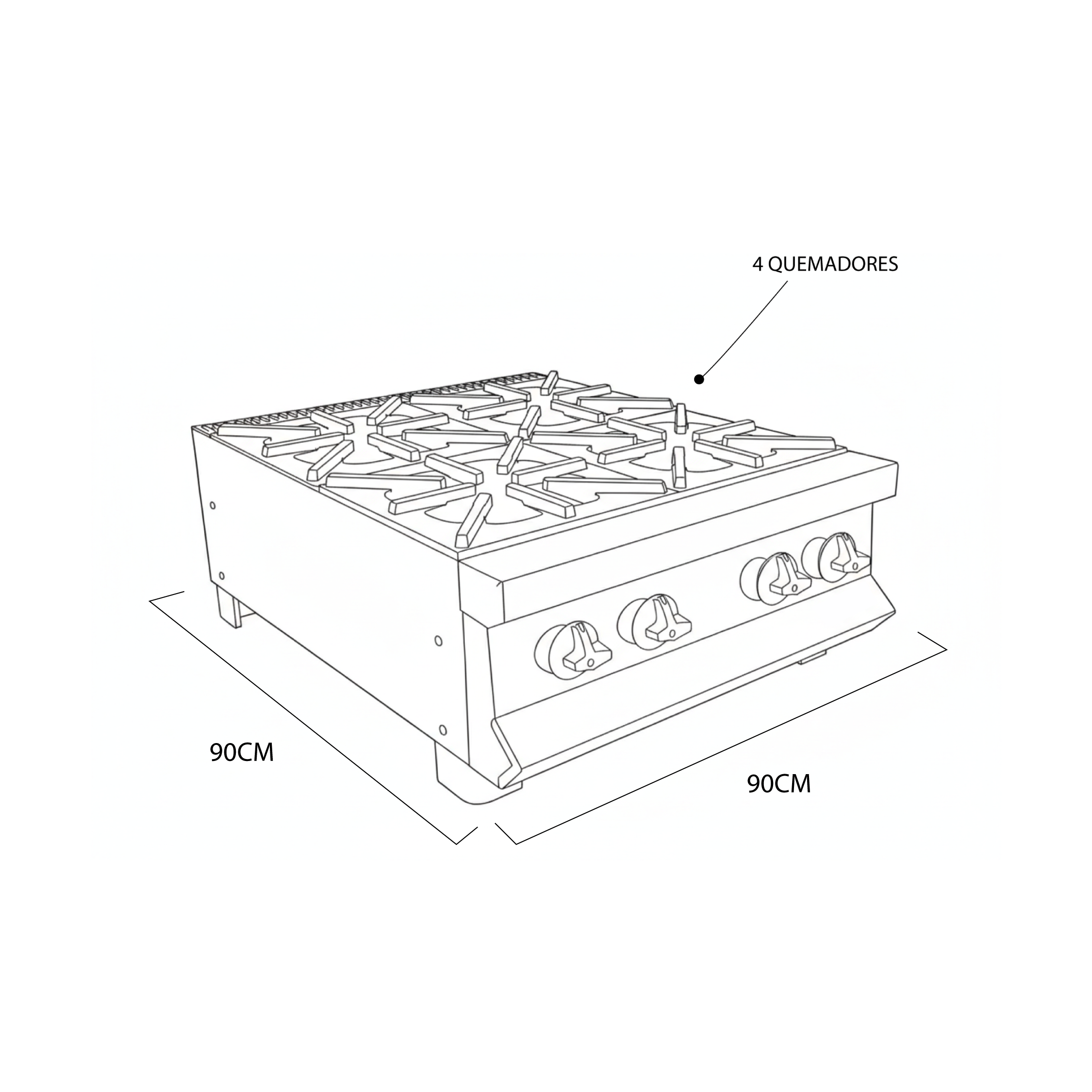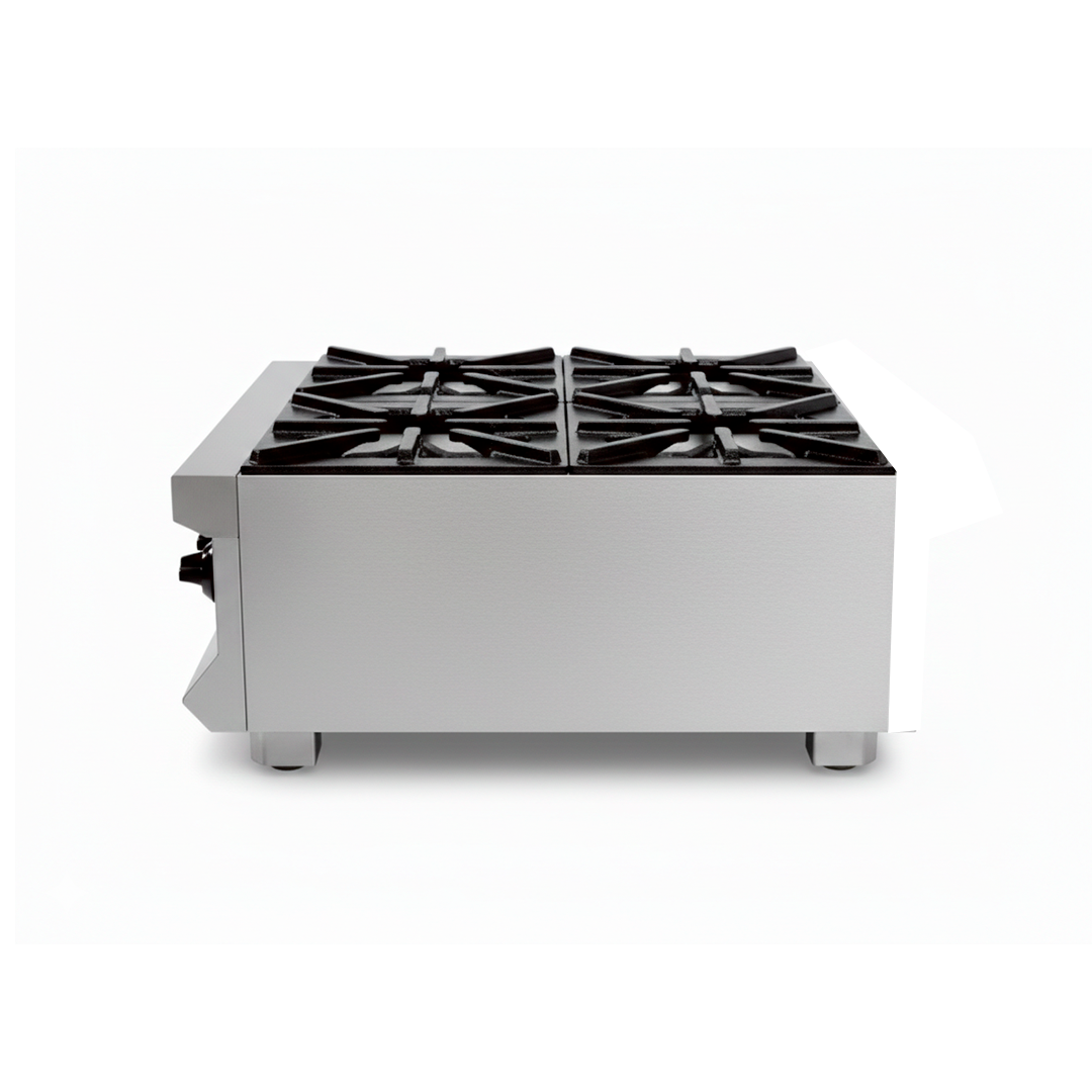 Equipo profesional de diseño compacto y funcional, ideal para cocinas comerciales que requieren mayor capacidad de producción. Fabricada en acero inoxidable, incorpora cuatro quemadores de alto rendimiento que ofrecen cocción uniforme y eficiente. Su formato tipo plantilla permite instalación práctica sobre superficie o estructura metálica, optimizando el espacio de trabajo. Resistente, fácil de limpiar y diseñada para uso continuo en entornos gastronómicos exigentes.