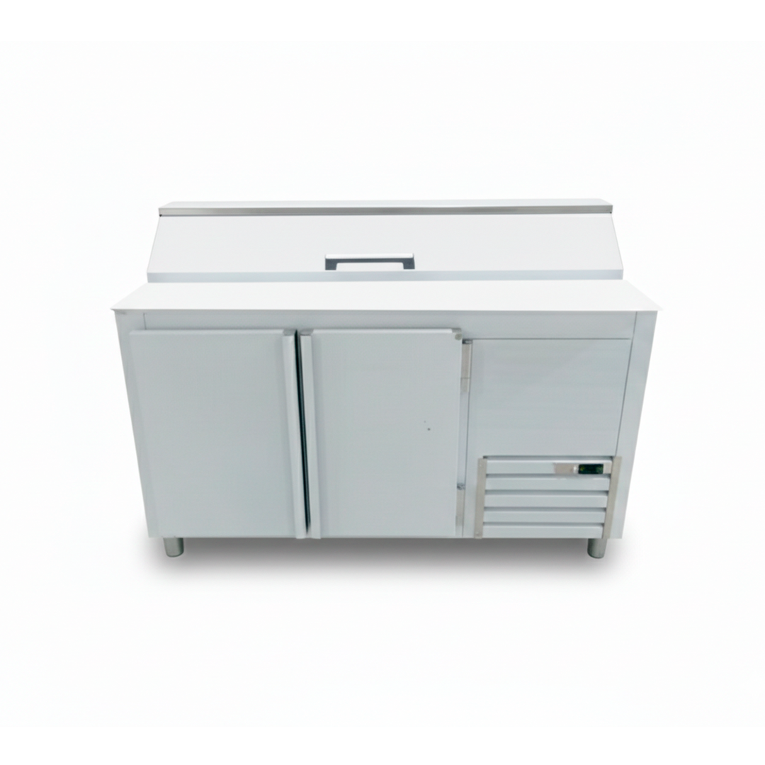 Mesa fría de 150 cm de frente, diseñada para combinar preparación y conservación en un solo equipo eficiente. Incorpora capucha superior para ingredientes, ideal para mantener toppings y productos frescos organizados, visibles y a temperatura adecuada.