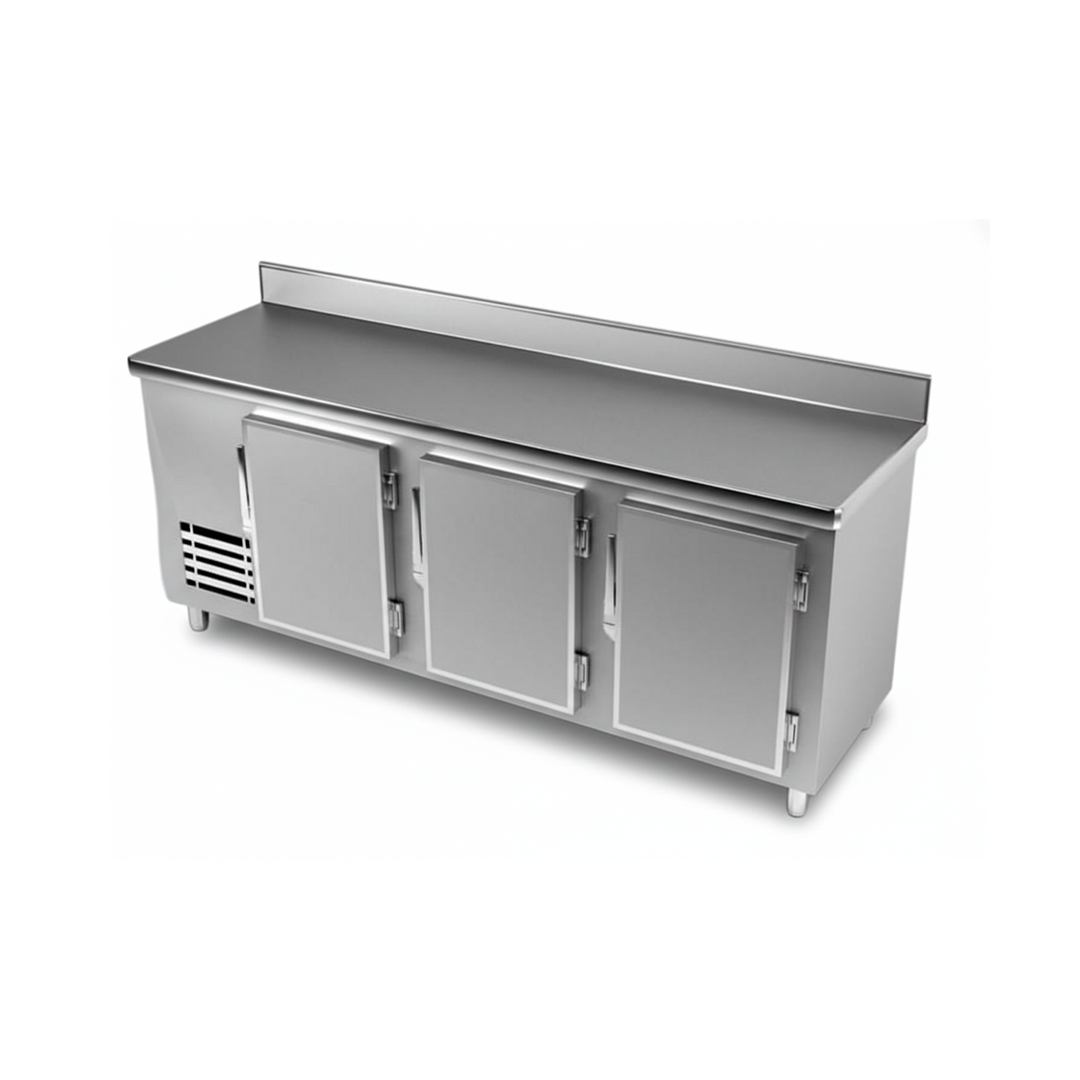 Mesa fría de 180 cm de frente, diseñada para integrar preparación y conservación en un solo módulo de alto rendimiento. Su sobre sólido de trabajo ofrece una superficie amplia, firme y de fácil limpieza, ideal para mise en place y armado continuo.
